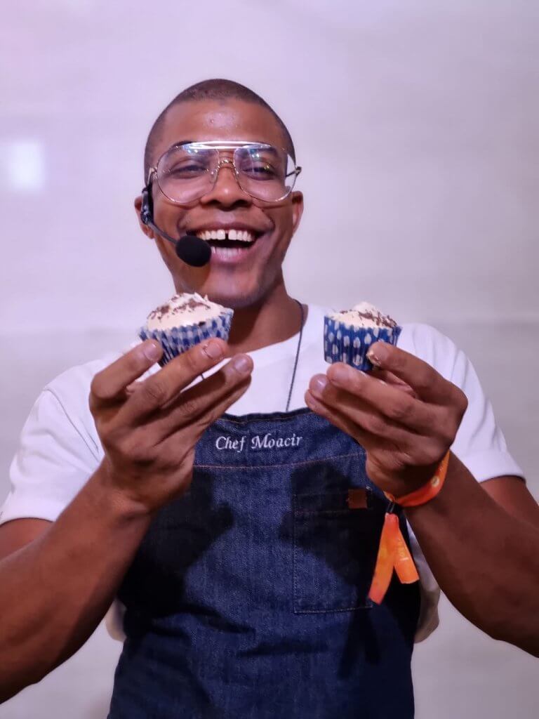 Participante do reality Mestre do Sabor, o chef Moacir Santana preparou Muffin de Chocolate com merengue de mel de cacau e nibs, acompanhado de uma turma de crianças na Arena Gastronômica.